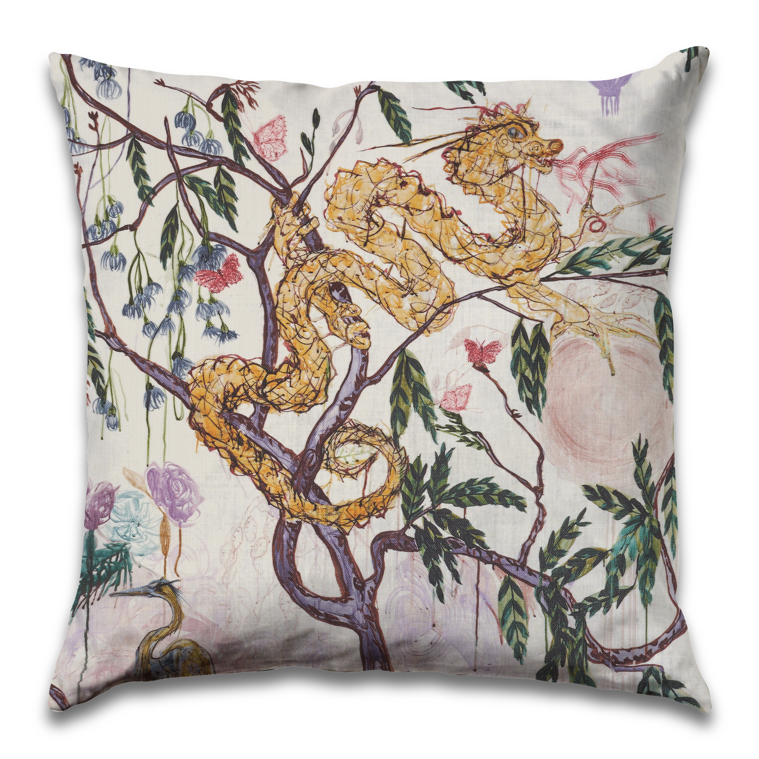 Celebrating our 10th anniversary, I really wanted to make a “wow” design. I had been painting a series of herons and initially thought it would just be a heron and wildlife design. Everything I came up with seemed to be falling flat, and I wanted the pattern to pack more punch.... Inspired by dragons in fashion, I started looking up the meaning of Chinese symbols. Good Fortune took on many symbols for prosperity, luck, health and wealth. A dragon holding a pearl, a heron, butterflies, a praying mantis, a red lantern and the money plant are all harbingers of Good Fortune.